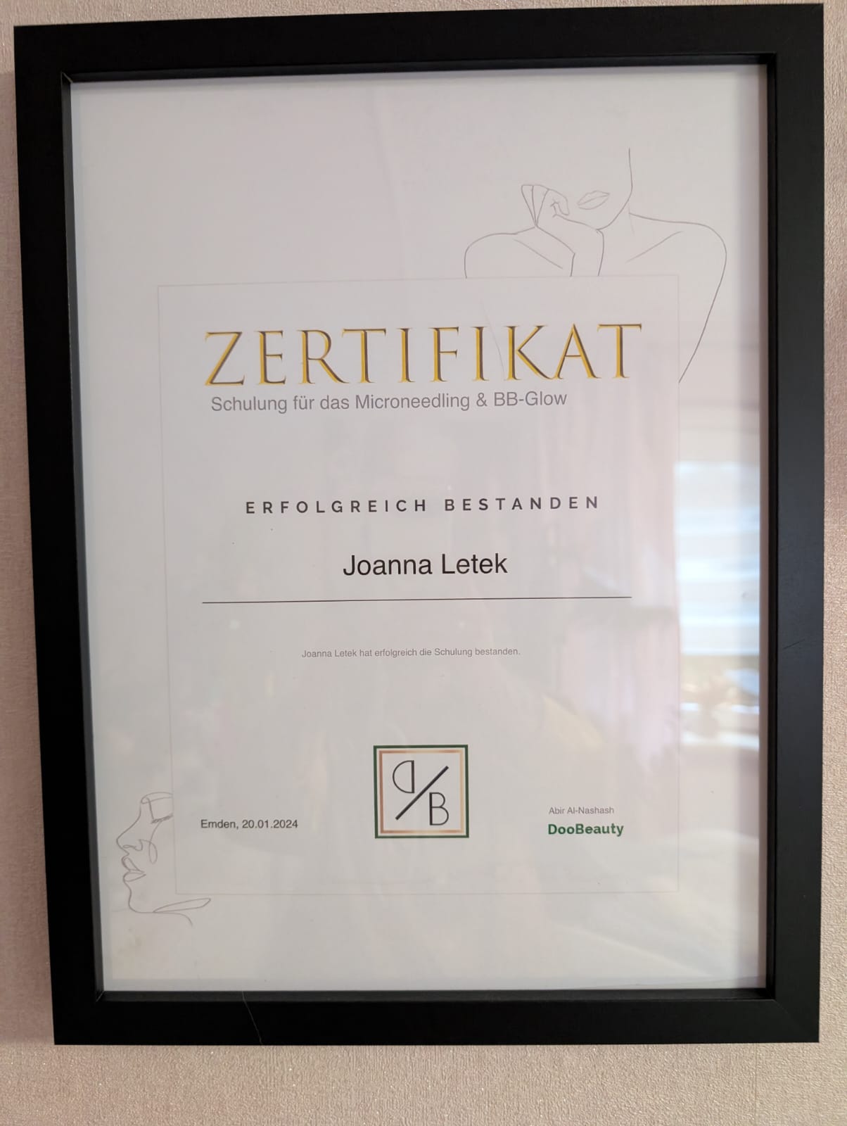 Ich bin Joanna Letek, Inhaberin und aktive Kraft hinter meinem Studio Jo Lashes. Mit Leidenschaft, Fachwissen und einer Vielzahl zertifizierter Qualifikationen kümmere ich mich persönlich um jeden Kunden. Sauberkeit und höchste Hygienestandards stehen bei mir an erster Stelle – so können Sie sich rundum wohl und sicher fühlen.